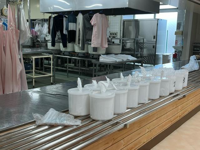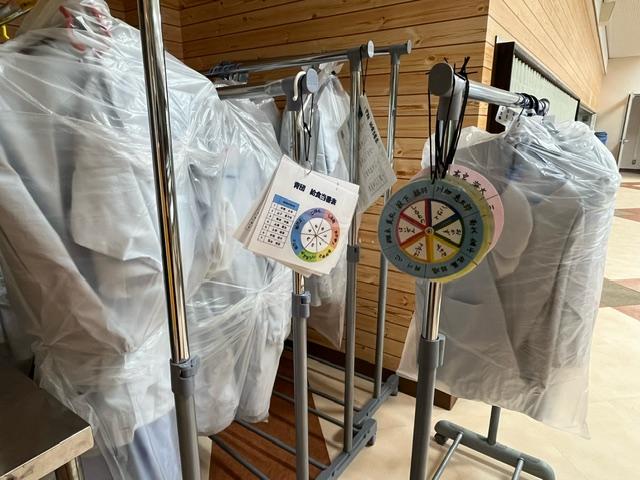 ランチルームの清掃が終わり、台拭き・エプロンなどが準備されています。