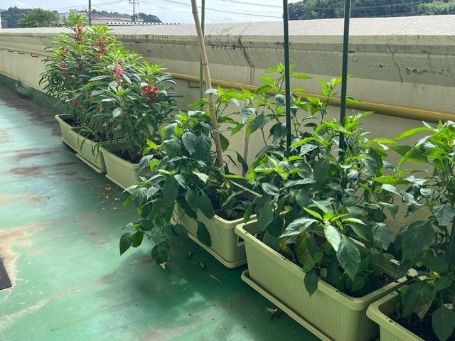 廊下には、黒板クリーナーがきれいに掃除されていました。3年生のベランダには、ホウセンカやピーマンなどが大きく成長していました。