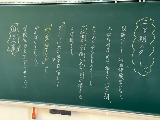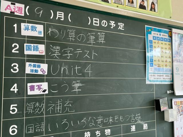 また、各教室の黒板には、担任から子どもたちへのメッセージが書かれていました。担任は、いつ書いたんだろう?
