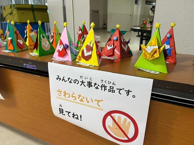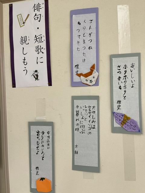 教室の中に飾られている俳句や短歌。そして、書いたものに添えられている折り紙。