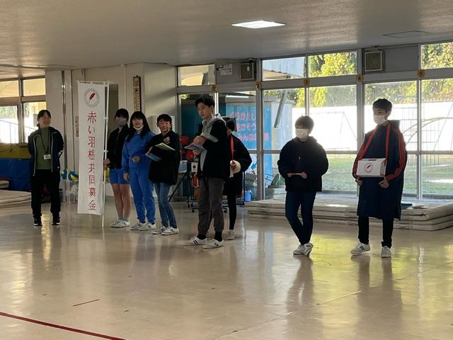 児童玄関では、寒い中、赤い羽根募金活動を行っていました!