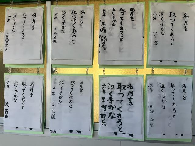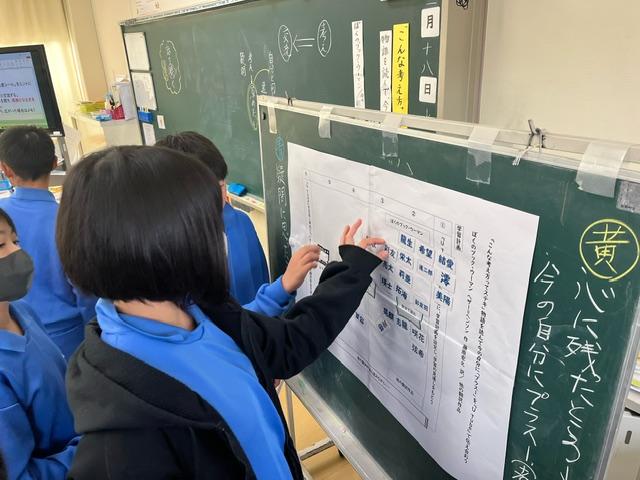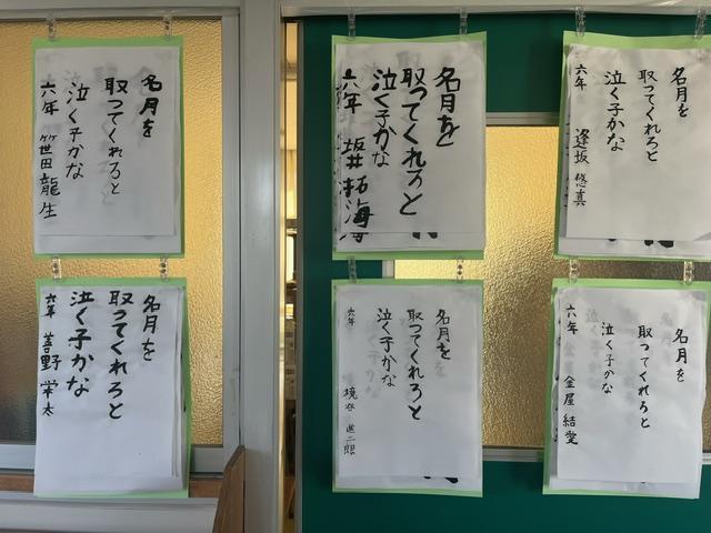 今日、教室をまわると、どの教室も机がきちんと並んでいました。ロッカーの中はもちろん、下足箱もとてもきれいになっていました。掲示物をみると4月~12月までの児童の活動の様子の写真が多く掲示してありました。6年生の予定黒板には、もうすでに1月8日の予定が書かれていました。『卒業に向けて』という言葉。一歩前に進むために、今、自分ができることに最善を尽くす。そんな宇出津っ子の心の中が見えてきて、涙が止まりません。
