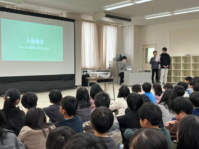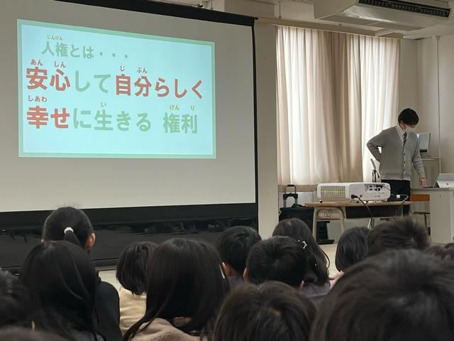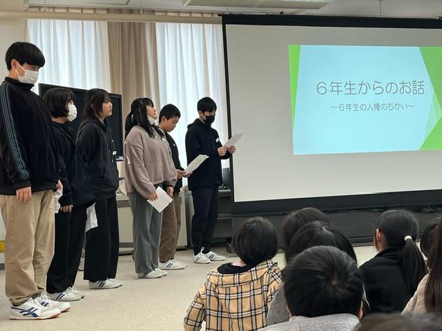 小屋敷先生のお話を聞いた後、6年生の人権の誓いについて発表がありました。どの児童も真剣に目と耳と心で聴いていました。
