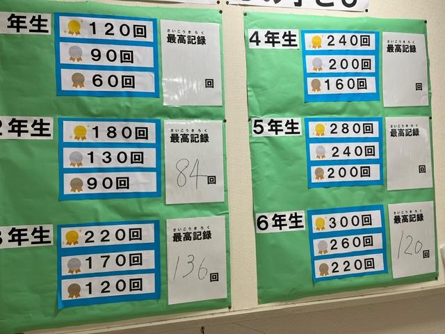 軽快に100回を超える児童、もう2重跳びができている児童、なんと片足2重跳びにチャレンジしている児童も。となりの教室では、仲間と一緒に回している縄跳びに入る練習をしている児童の姿もみられました。