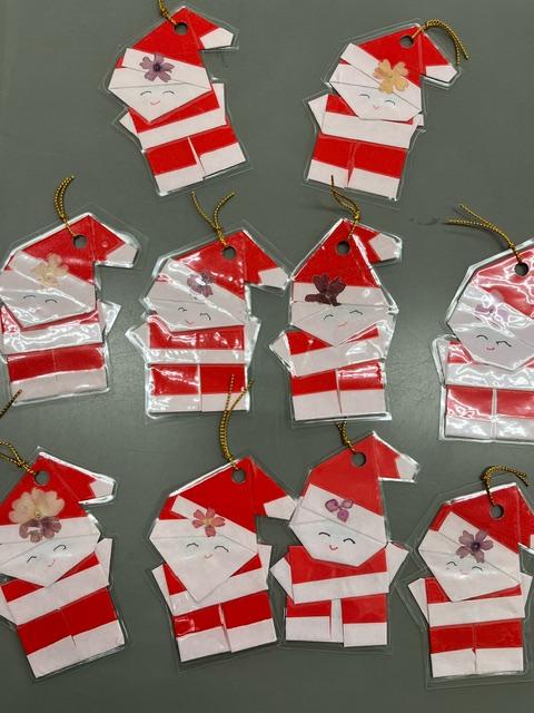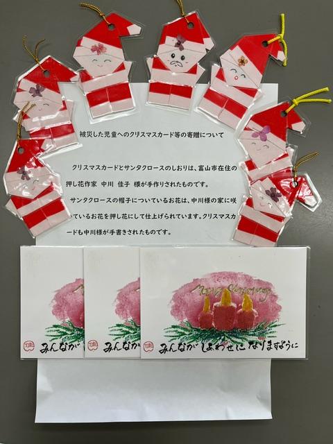 奥能登教育事務所を通じ、富山県在住の押し花作家中川佳子さんより、折り紙で作られたサンタクロースと手書きのメッセージ入りのクリスマスカードが届けられました。