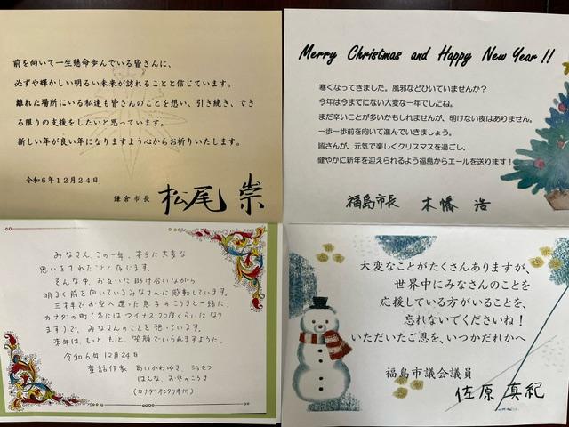手書きの心温まるカード。児童一人1枚ずつ配付します。鎌倉市長さんや福島市長さん、福島市の議員さんなどからも届けられました。