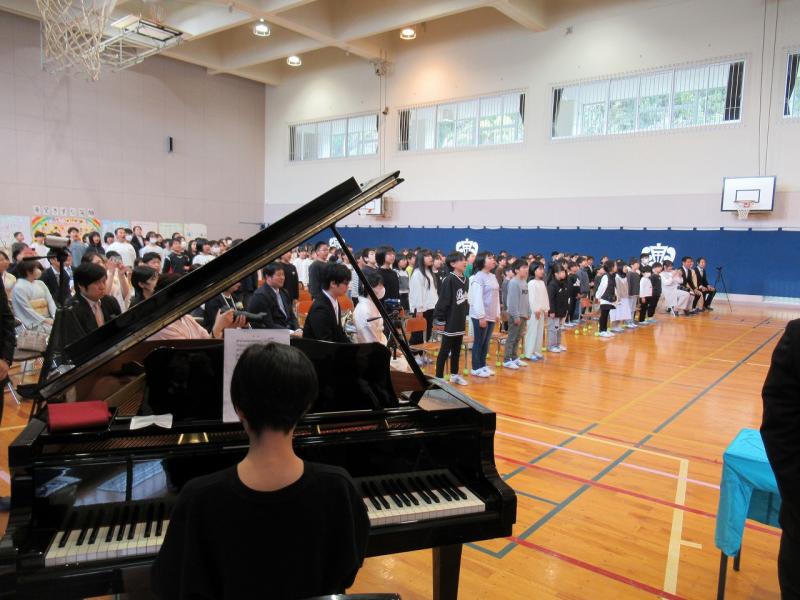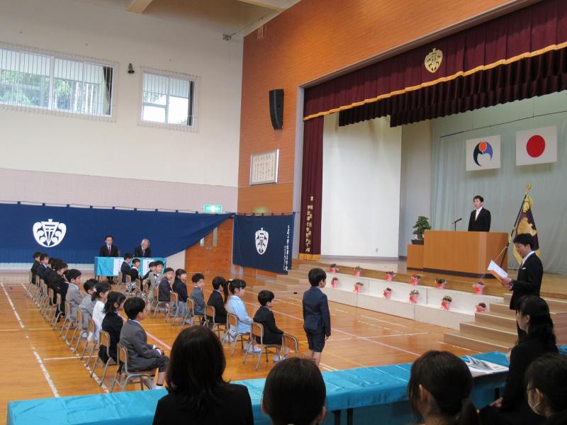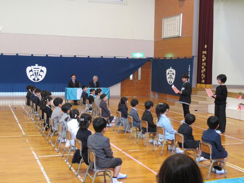 1年生を2~6年生の大きな声の国歌、校歌で迎えます。