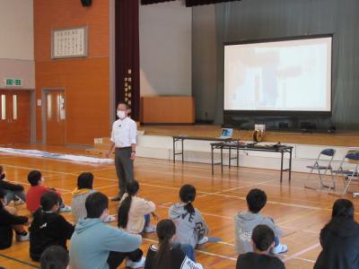 出前授業では、海に棲むクジラとはどのような生き物なのか、等身大のクジラの絵、クジラを調べるにはどのような調査研究があるのか等、クジラの実物の歯、ひげ、耳骨等を用いて説明していただきました。特に30mを超える等身大のクジラの絵は、迫力満点でした。
