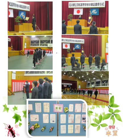 本校体育館において、令和2年度第49回卒業証書授与式が行われました。今年度は、石川県教育委員会から新型コロナウィルス感染症対策として規模縮小の要請をうけ、来賓の出席をご遠慮いただきました。4年次生9名、3年次生1名、計10名がめでたく卒業しました。写真で卒業式の様子をお伝えします。