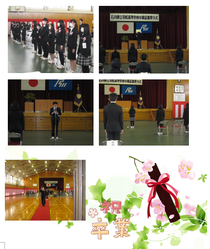 今年度は、文部科学省、石川県教育委員会から新型コロナウィルス感染症対策として規模縮小の要請をうけ、来賓の出席をご遠慮いただきました。4年次生8名、3年次生5名、計13名がめでたく卒業しました。写真で卒業式の様子をお伝えします。
