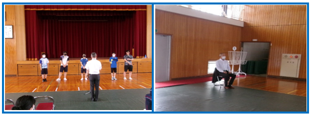 本校は卓球競技に1名とバドミントン競技に4名が出場します。学校長、教育振興会会長の西塔正樹氏、生徒会副会長が激励の言葉をかけました。これを受けて選手を代表して山本拓海さんと藤森祈愛さんが「日頃の練習の成果を発揮し、精一杯戦ってきます。」と決意表明を行いました。
