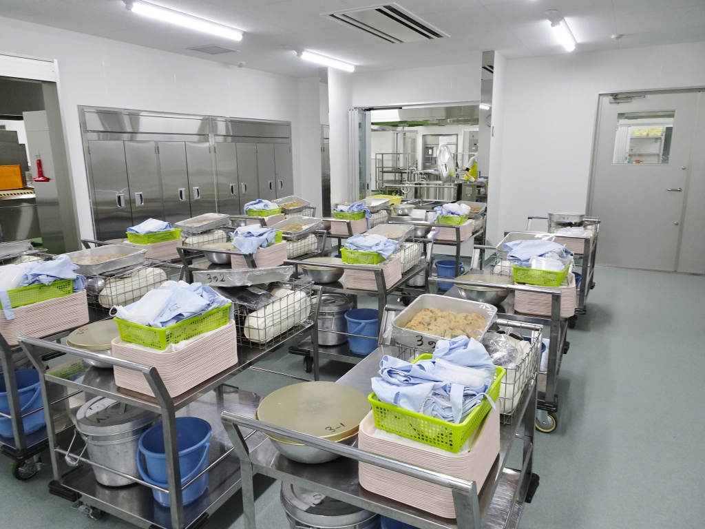 給食をクラスごとの配膳車にセッティングする部屋です。