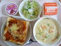 プレートに厚切りミルク食パンを並べ、具をのせ、とろけるチーズをかけてスチームコンベクションで焼きました。