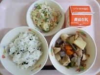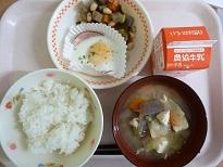 ぜんざいの小豆、大豆、きなこ、そぼろの中には大豆ミートミンチ、のっぺい汁には油揚げ・・豆類や豆加工品をたくさん使った節分給食でした