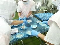 給食のハムエッグはカップにハム、卵を入れてスチームをかけて作っています