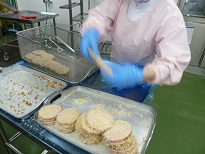 今日は、焼いたハンバーグに穴水産しめじとごぼう、にんじんで作った和風のあんかけソースをかけて盛り付けました