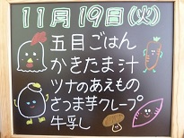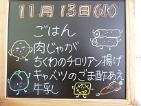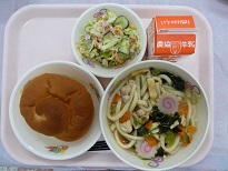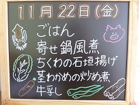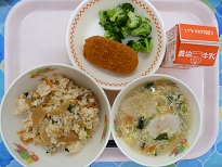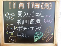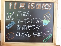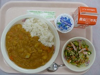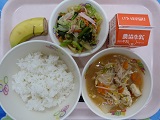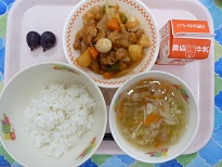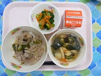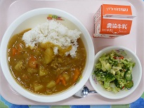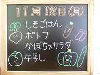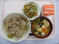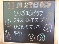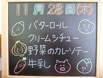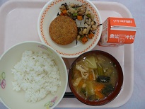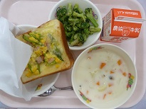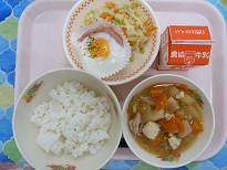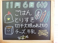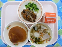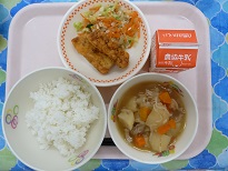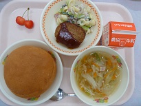 ポトフには、にんじん、キャベツ、じゃがいも、かぶ、サラダにはかぼちゃ、きゅうり、にんじんとたくさんの野菜が使われていましたが、「かぼちゃは風邪の予防になるβ‐カロテンが多いですよ」という健康委員の放送のおかげかほとんど残りはありませんでした