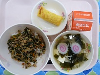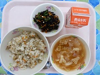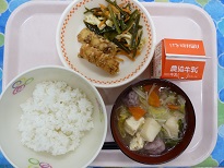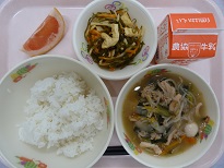 今日の地元産、県内産食材は、米、牛乳、豚肉、白菜、大根、ねぎ、小松菜、米粉、はたはた、茎わかめ、干しいたけでした
