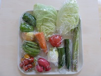 いろいろな野菜を70gずつに分けたものを準備し、色の濃い野菜2種類、色の薄い野菜を3種類選ぶと350gのめやすになるというお話をしました。健康のため、野菜をたくさんとるようにしたいものですね