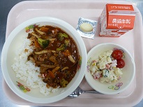 今日の地場産物、県内産食材は、米、牛乳、豚ひき肉、大豆ペースト、しょうが、にんにく、しいたけ、きゅうりでした