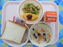ミルク食パン0.1%、ジャムゼロ、さつま芋としめじのシチュー1.5%、オムレツ0.2%、野菜のごまあえ0.8%、牛乳0.7%でした