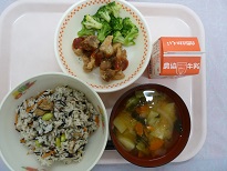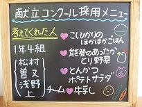 今日の献立は、1年4組の北出さん、森下さん、中尾さん、茶園さんグループが考えてくれたものです