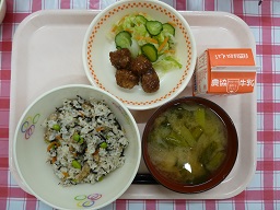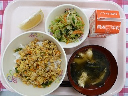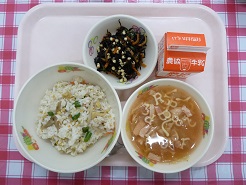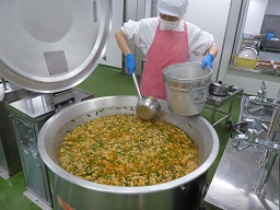 チキンライスは学校で煮た具を、ごはん屋さんから届いた麦ごはんに混ぜて出しています