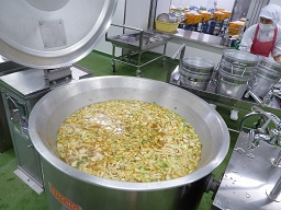 ~回転釜で具を炒めておいて、ゆでた麺を合わせます(2釜で)~