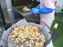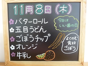 今日は、「いい歯の日」ということで、よくかんで食べるメニュー「ごぼうチップ」を出しました太めのごぼうを頼んであったので、斜めに手切りでスライスして、しょうゆ、さとう、みりんで下味をつけ、片栗粉と米粉をブレンドした粉をつけて揚げました