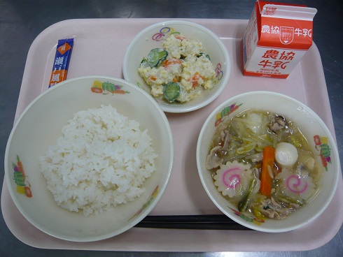 牛乳、ビーフライス、ツナサラダ、中華スープ