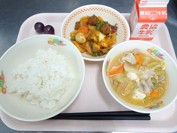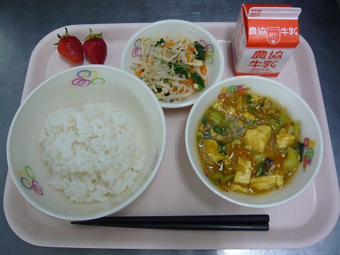 牛乳、ごはん、マーボー豆腐、中華あえ、メロン