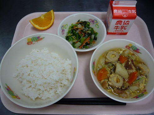牛乳、ごはん、竹輪の磯辺揚げ、五目なます、たまごスープ