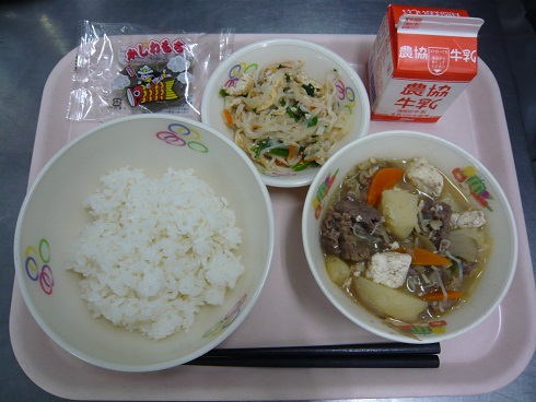 牛乳、ごはん、肉じゃが、ホロホロ和え、のり佃煮