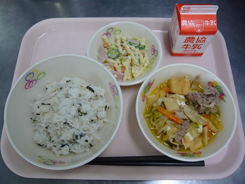 牛乳、わかめごはん、厚揚げと肉のみそ炒め、マカロニサラダ