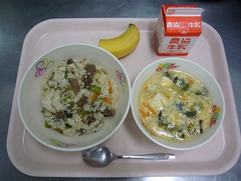 牛乳、ビーフライス、サンラータン、バナナ、牛乳