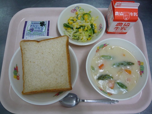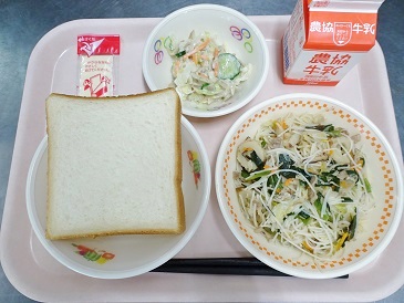 ミルク食パン、クリームスパゲティ、ごぼうサラダ、クリーム、牛乳