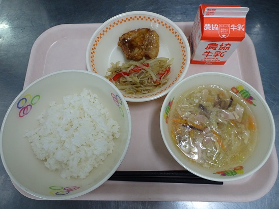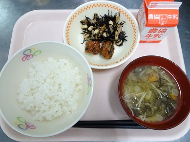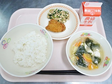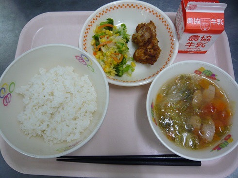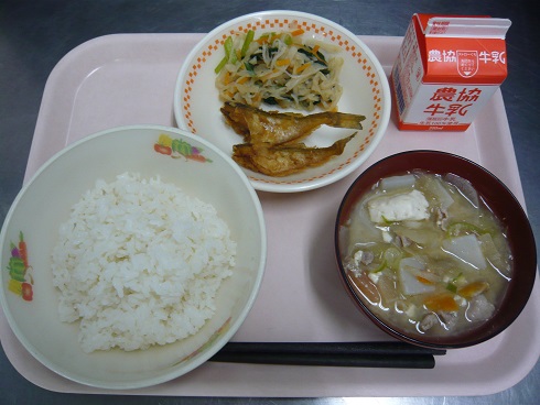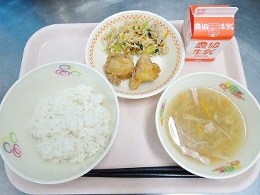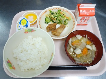 牛乳、ごはん、とりのから揚げ、白菜のおかか和え、みそ汁、木耳のり