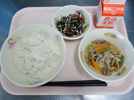 ワカメごはん、すきやき風煮、しらす和え、牛乳