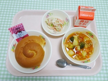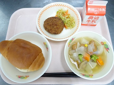 バターロール、メンチカツ、カレーキャベツ、ポトフ、牛乳