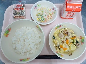 牛乳、ごはん、卵とじ、ひじきのマリネ、ふりかけ