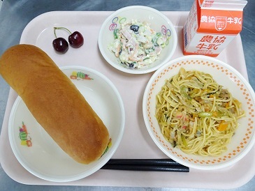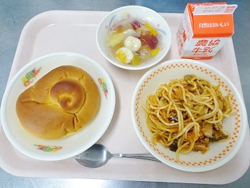 牛乳、ミルクロール、スパゲッティソテー、ヨーグルト和え、いちごマーガリン