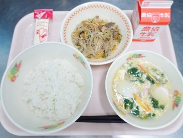 ごはん、含め煮、春雨サラダ、ふりかけ、牛乳
