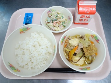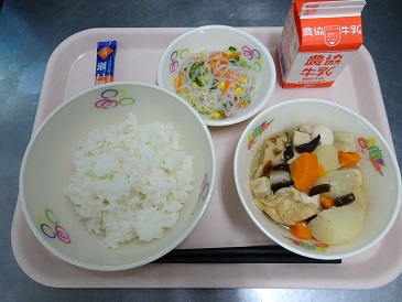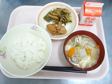 ごはん、鶏のからあげ、ホロホロ和え、いものこ汁、牛乳