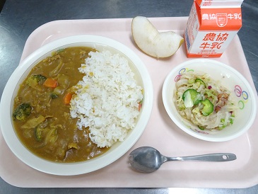 ポークカレー、梅おかか和え、フルーツ、牛乳