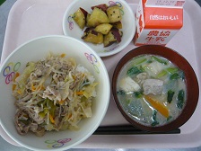 豚丼、かす汁、大学芋、牛乳