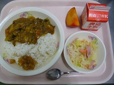 カレーライス、大根サラダ、福神漬け、柿、牛乳