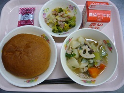 ごはん、とりのから揚げ、なます、みそ汁、牛乳