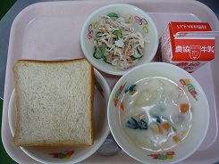 胚芽食パン、クリームシチュー、かみかみサラダ、牛乳