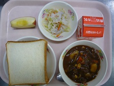 ミルク食パン、ビーフシチュー、蓮根サラダ、りんご、牛乳