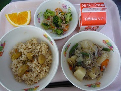 くりごはん、肉じゃが、ツナサラダ、オレンジ、牛乳